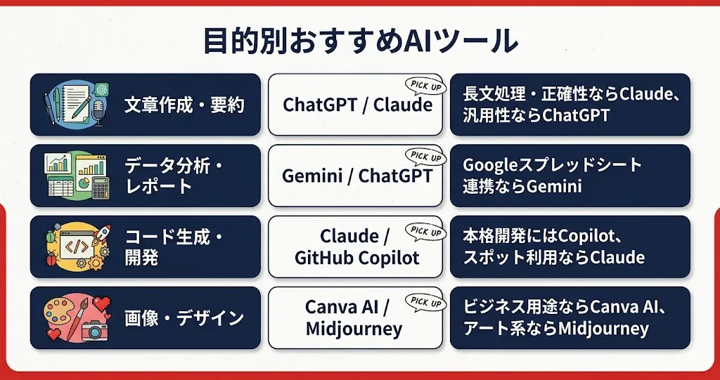 | コード生成・レビュー | Claude Code | 長文コンテキスト対応・指示への忠実性・IDE統合 |